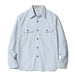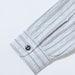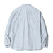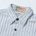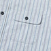 Inspired by the fabrics used in vintage French pullover work shirts made from indigo yarns, these work shirts are made with five different colours of cotton yarn (off white, grey, blue, purple, and indigo) to create a complex vertical stripe pattern with a bluish-white backdrop, cut in the style of a classic American work shirt. Finished with aged metal cat's eye buttons, and featuring classic workwear details such as asymmetrical chest pockets, contrasting red chainstitch runoff, a hidden throat latch, and double-needle chainstitch construction.