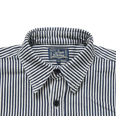 This Studio D'Artisan's classic work shirt, in their original 14oz Hickory Stripe fabric. Woven on vintage power looms at low tension to give the f...