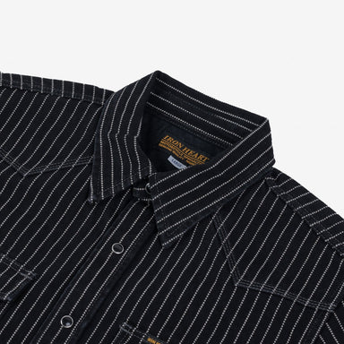 Iron Heart's classic western cut shirt made from a 12oz indigo wabash fabric, the weft and the warp are both indigo rope dyed and the dots are blea...