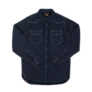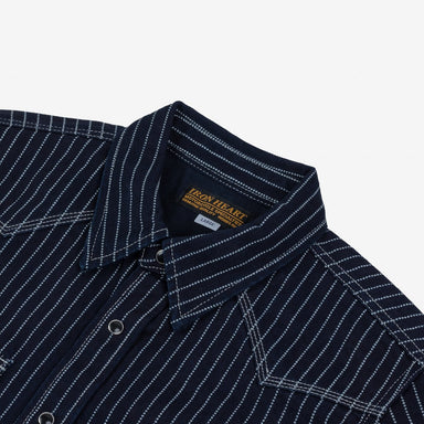 Iron Heart's classic western cut shirt made from a 12oz indigo wabash fabric, the weft and the warp are both indigo rope dyed and the dots are ble...