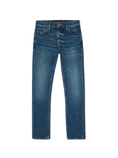 Slim-fit jeans featuring a straight leg in a mid-blue wash, boasting a gently worn appearance and a stunning blue hue. Crafted from Nudie's belove...