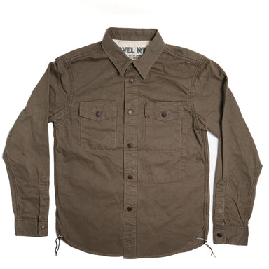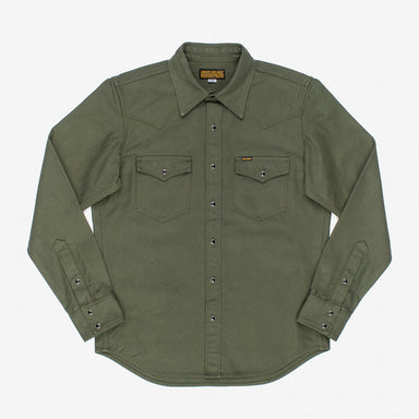 Iron Heart's classic western cut shirt in a 13oz sulphur-dyed olive drab green military grade heavy cotton serge, with black snaps, and made with o...