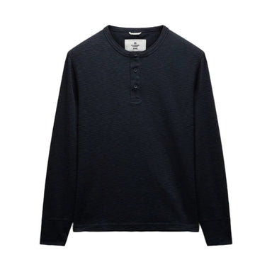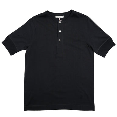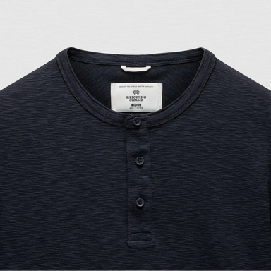 A long sleeve henley made with custom-developed 1x1 slub rib cotton. Designed with a corozo button placket, semi-raglan sleeves, self-fabric collar...